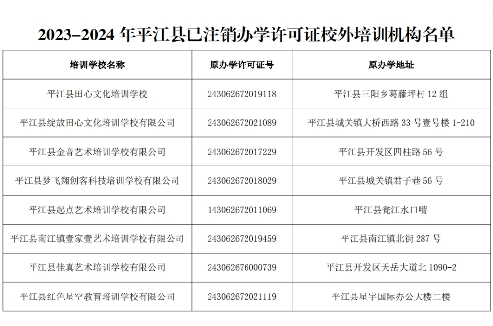 根据《中华人民共和国教育法》《中华人民共和国民办教育促进法》等法律规定,经举办者主动申请,平江县教育局审核同意,2023年1月至2024年5月有平江县田心文化培训学校等8所校外教育培训机构(名单详见附件)已完成注销流程,现将该已注销校外培训机构予以公告。