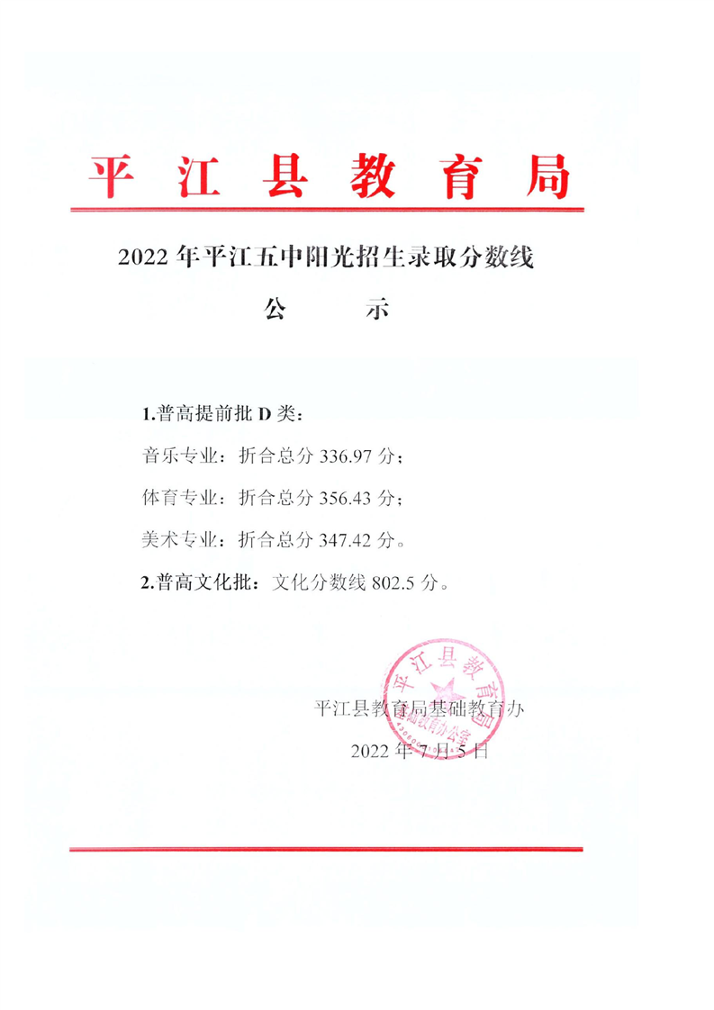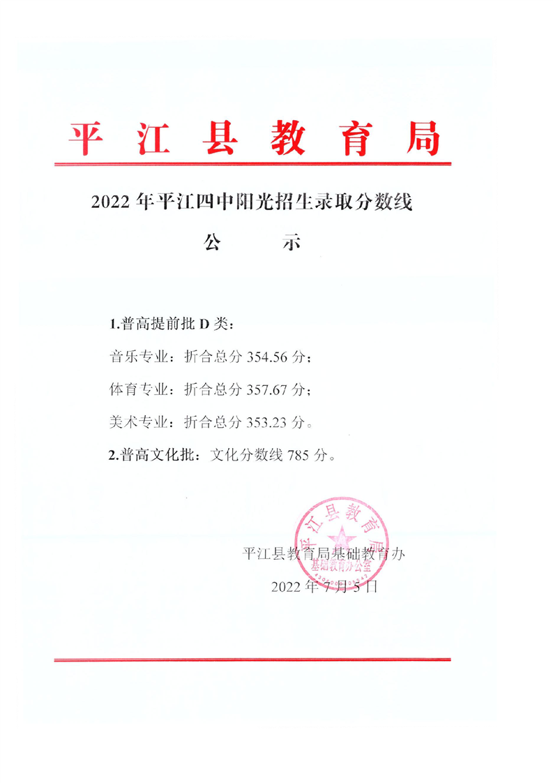 2022年平江二中、三中、四中、五中、七中、十中阳光招生录取分数线公示