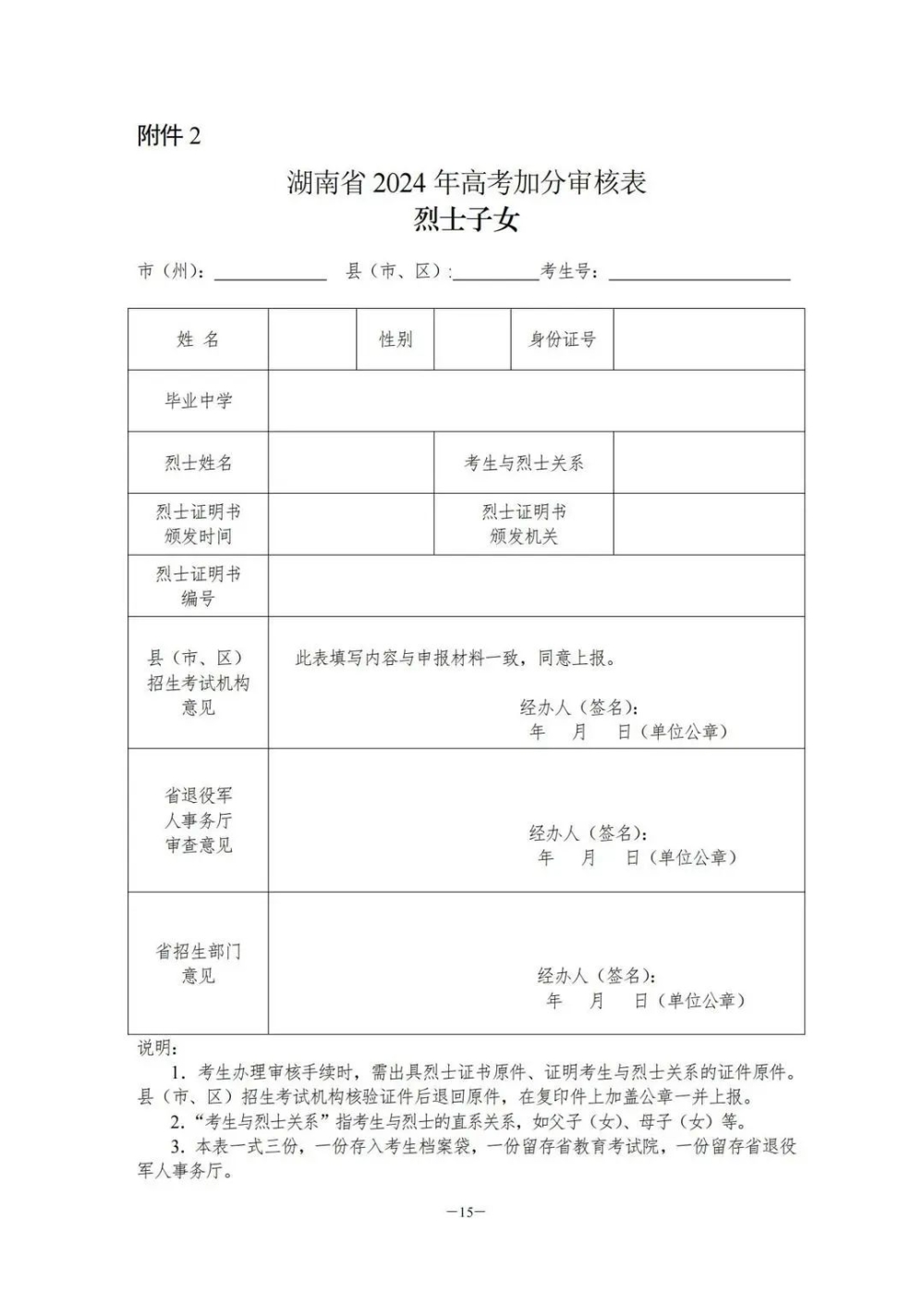 (1)2024年1月25日起,高级中等教育学校(报名点)可打印下列表格:烈士子女高考加分审核表;服役期间荣立二等功以上或被战区(原大军区)以上单位授予荣誉称号的退役军人高考加分审核表;归侨、归侨子女、华侨子女高考加分审核表;台湾省籍考生高考加分审核表;台湾户籍考生高考加分审核表;自主就业的退役士兵高考加分审核表;国家专项计划招生报名资格审核表;高校专项计划招生报名资格审核表。