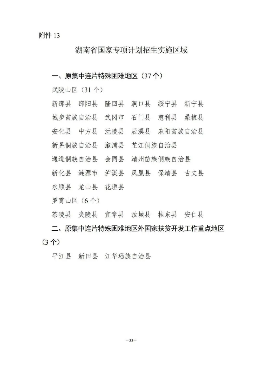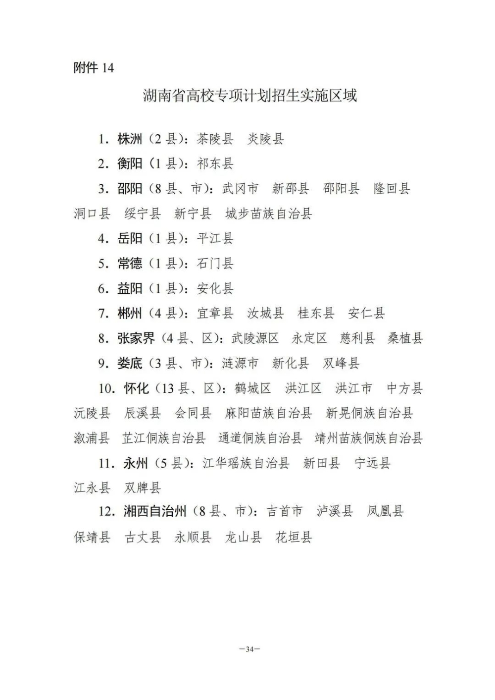 (三)高校专项计划。按照相关规定,我省实施高校专项计划的区域为茶陵县等51 个县(市、区)(见附件14)。报考学生须同时具备以下基本条件:(1)符合我省2024年统一高考报名条件并已参加当年高考报名;(2)考生本人及其父亲或母亲或法定监护人户籍在我省实施区域且城乡分类代码确定为乡村区域(国家统计局公布的2023年统计用区划代码和城乡划分代码中城乡分类代码首位为“2”),或在我省户籍制度改革实施时(2015年12月31日)户籍为我省实施区域的农业户口,其中考生本人须具有当地连续3年以上户籍;(3)考生本人具有户籍所在县(市、区)高中连续3年学籍并实际就读。在此基础上,有关高校可提出其他报考要求并在招生简章中明确。