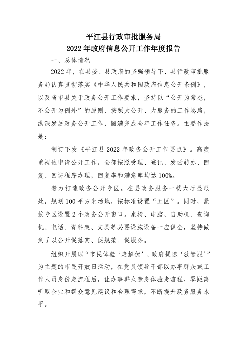 平江县行政审批服务局2022年政府信息公开工作年度报告