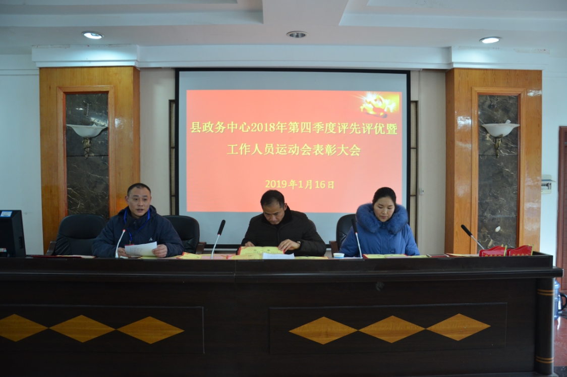 1月16日上午,县政务中心在机关一楼会议室举行2018年第四季度大厅先进及工作人员运动会表彰大会。政务中心分管机关的党组成员、副主任李志霞,分管大厅的党组成员刘靓亮,相关股室长、驻大厅各窗口负责人、获奖的大厅窗口和机关工作人员参加会议。