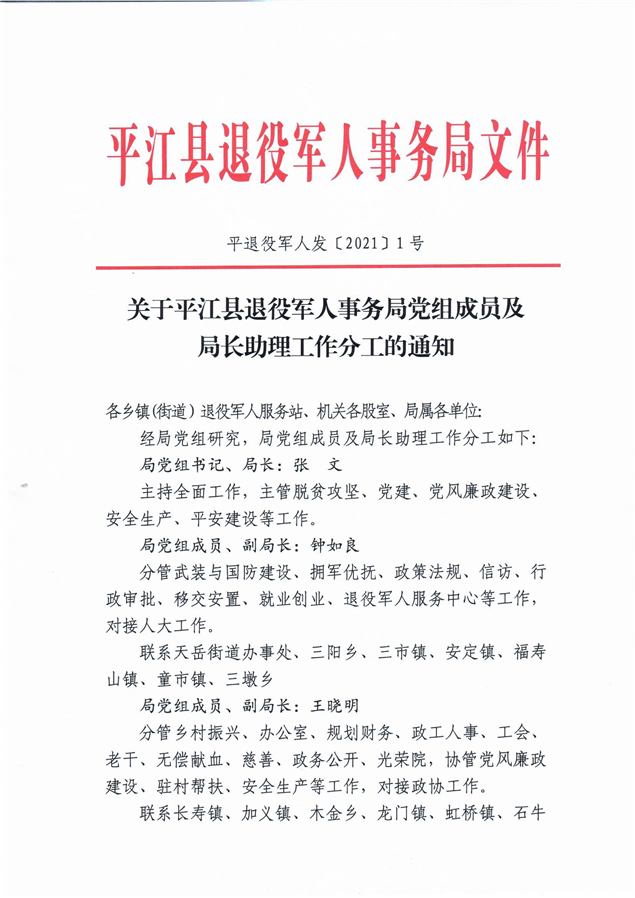 关于平江县退役军人事务局党组成员分工及局长助理工作工安排通知