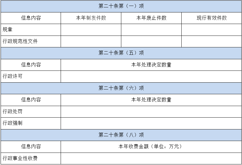 这一项主要报告《中华人民共和国政府信息公开条例》第二十条规定的法定主动公开内容中,适宜以数据方式呈现且具备统计汇总价值的内容,包括(一)(五)(六)(八)共四项,其中,第(五)项的行政许可数量、第(六)项的行政处罚和行政强制数量,包括已公开和依法未公开的全部处理决定。各项数据核定时间点为报告年度的12月31日。