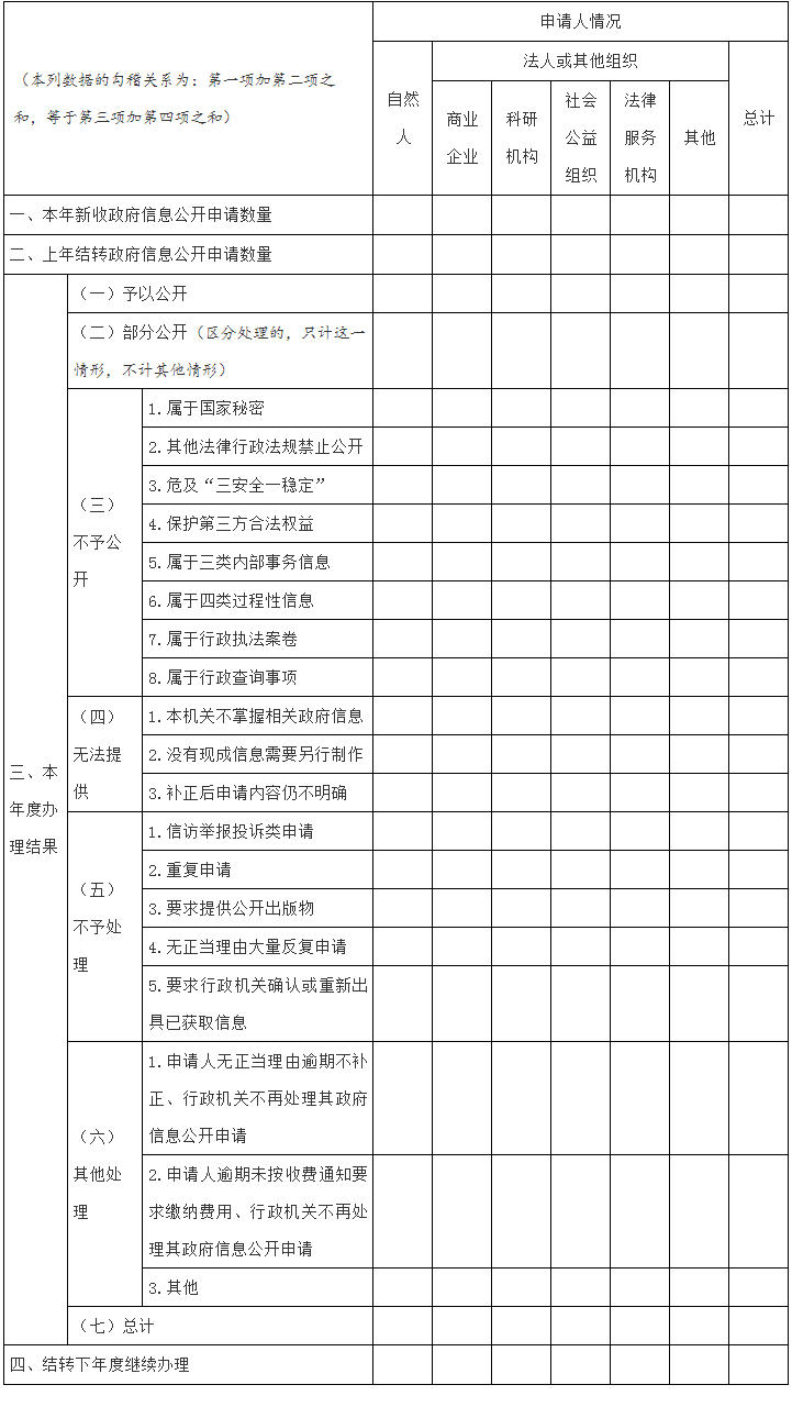 这一项主要报告两方面情况:一是申请人的类别;二是政府信息公开申请的最终处理结果。此项内容重在数据准确、要素齐备,全面客观反映政府信息公开申请接收和办理情况,便于政府信息公开工作主管部门全面掌握工作动态,使社会各界了解政府公开透明进程。