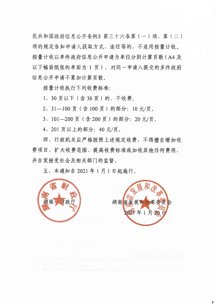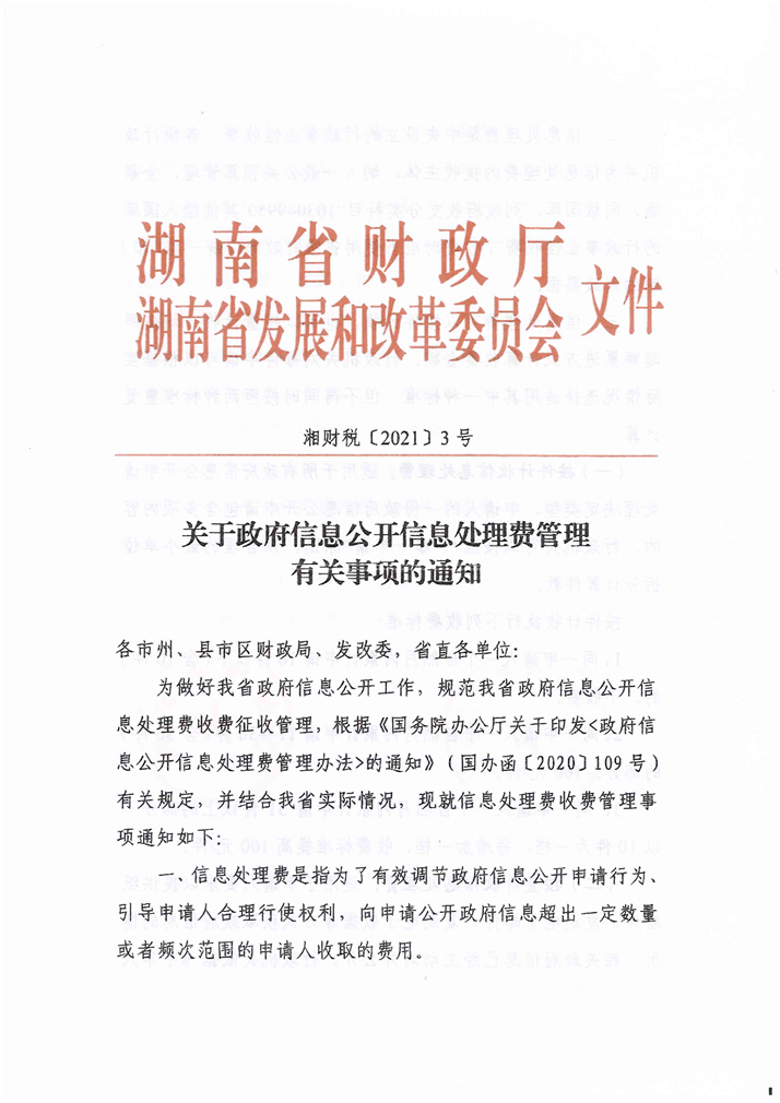 省财政厅、省发展改革委《关于政府信息公开信息处理费管理有关事项的通知》(湘财税〔2021〕3号)