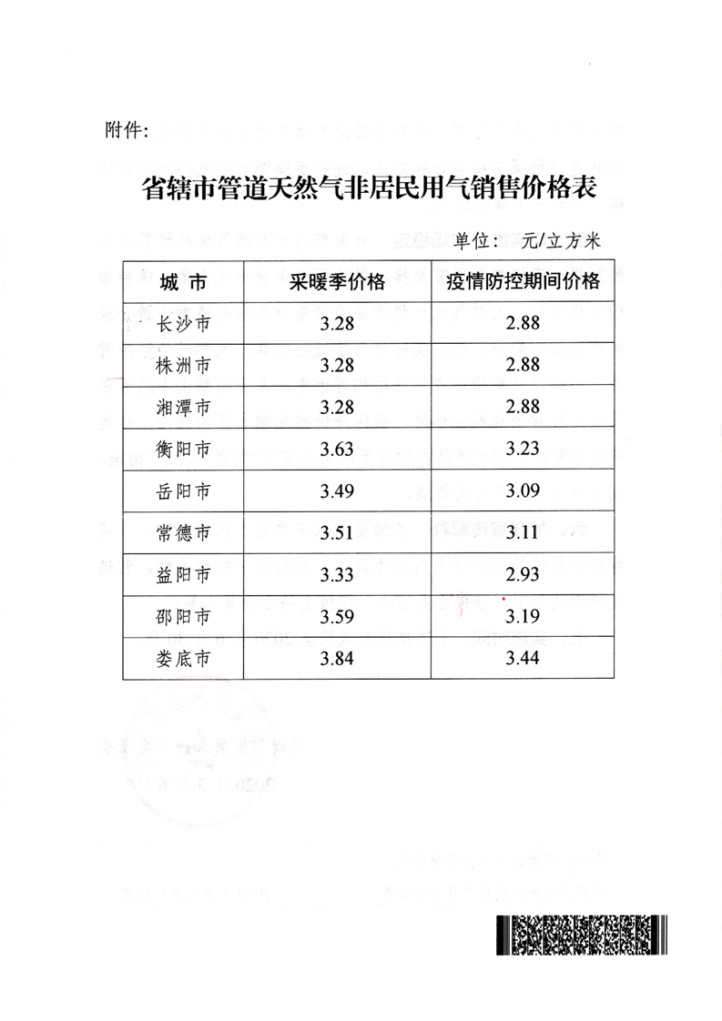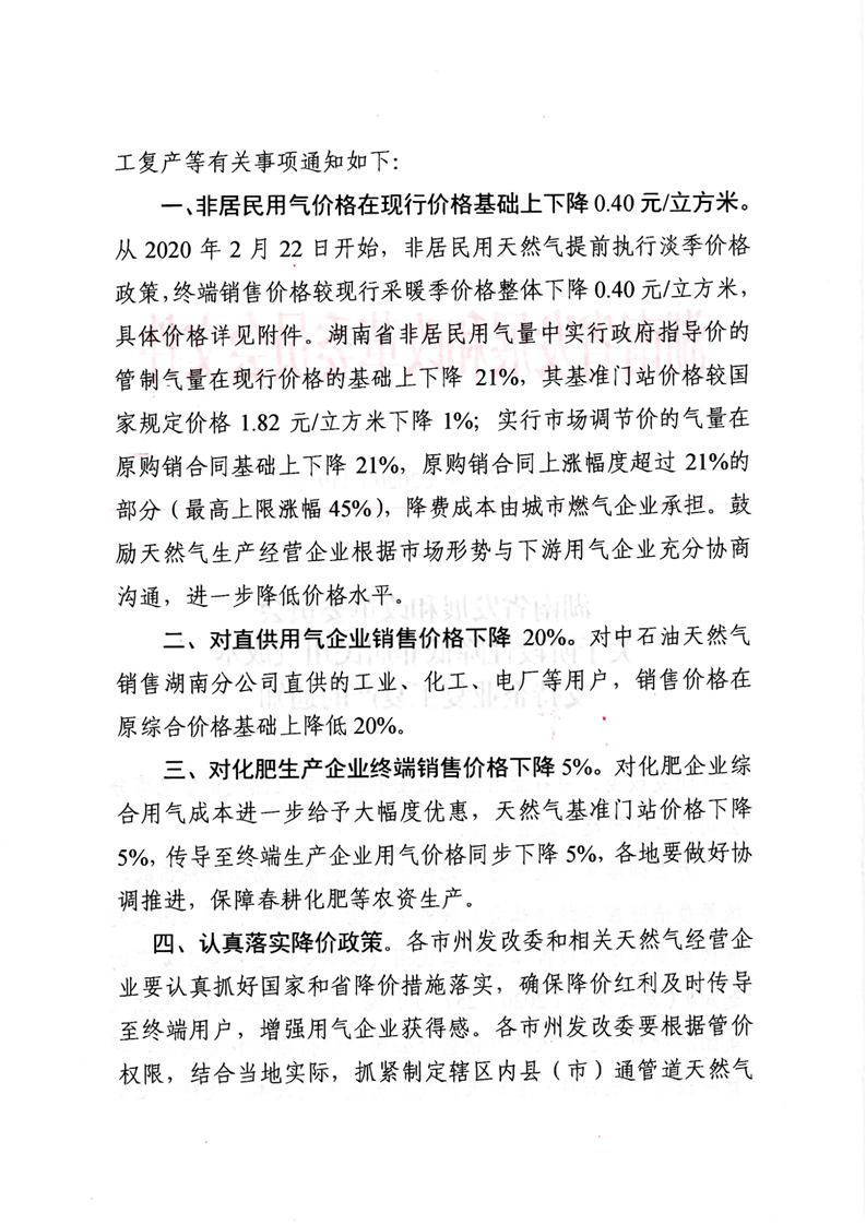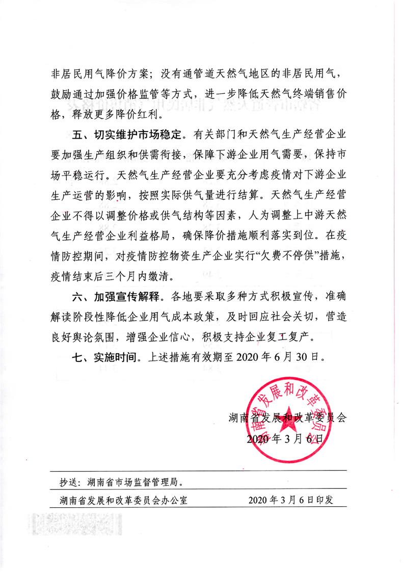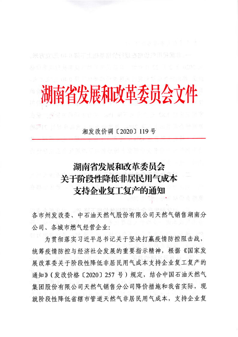 湖南省发展和改革委员会关于阶段性降低非居民用气成本支持企业复工复产的通知