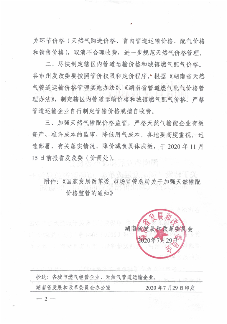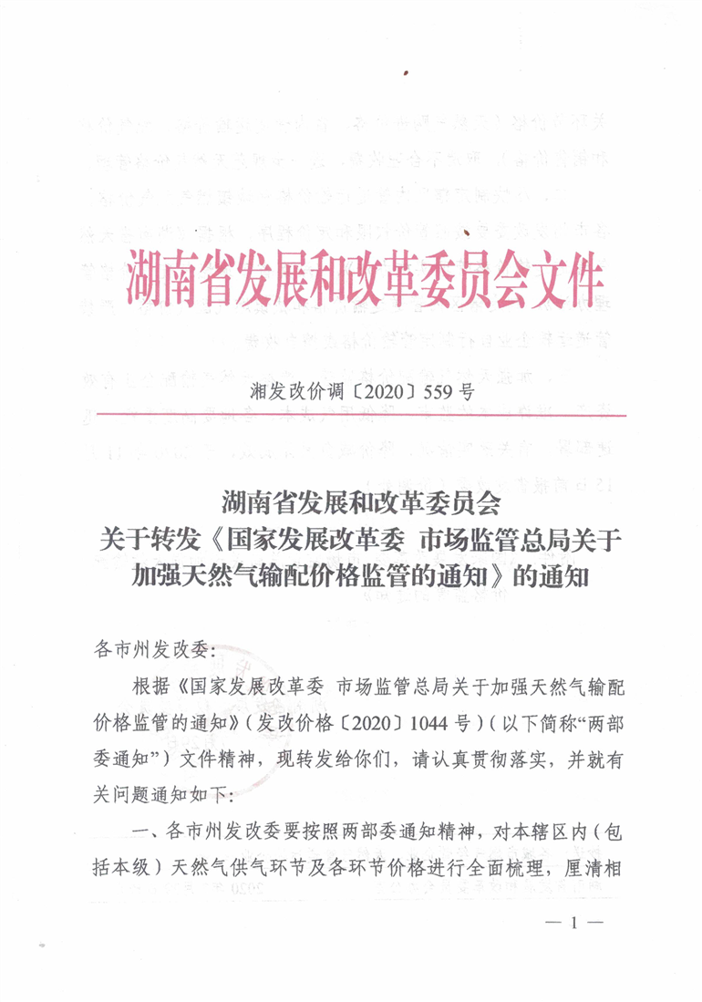 湖南省发展和改革委员会关于转发《国家发展改革委 市场监管总局关于加强天然气输配价格监管的通知》的通知