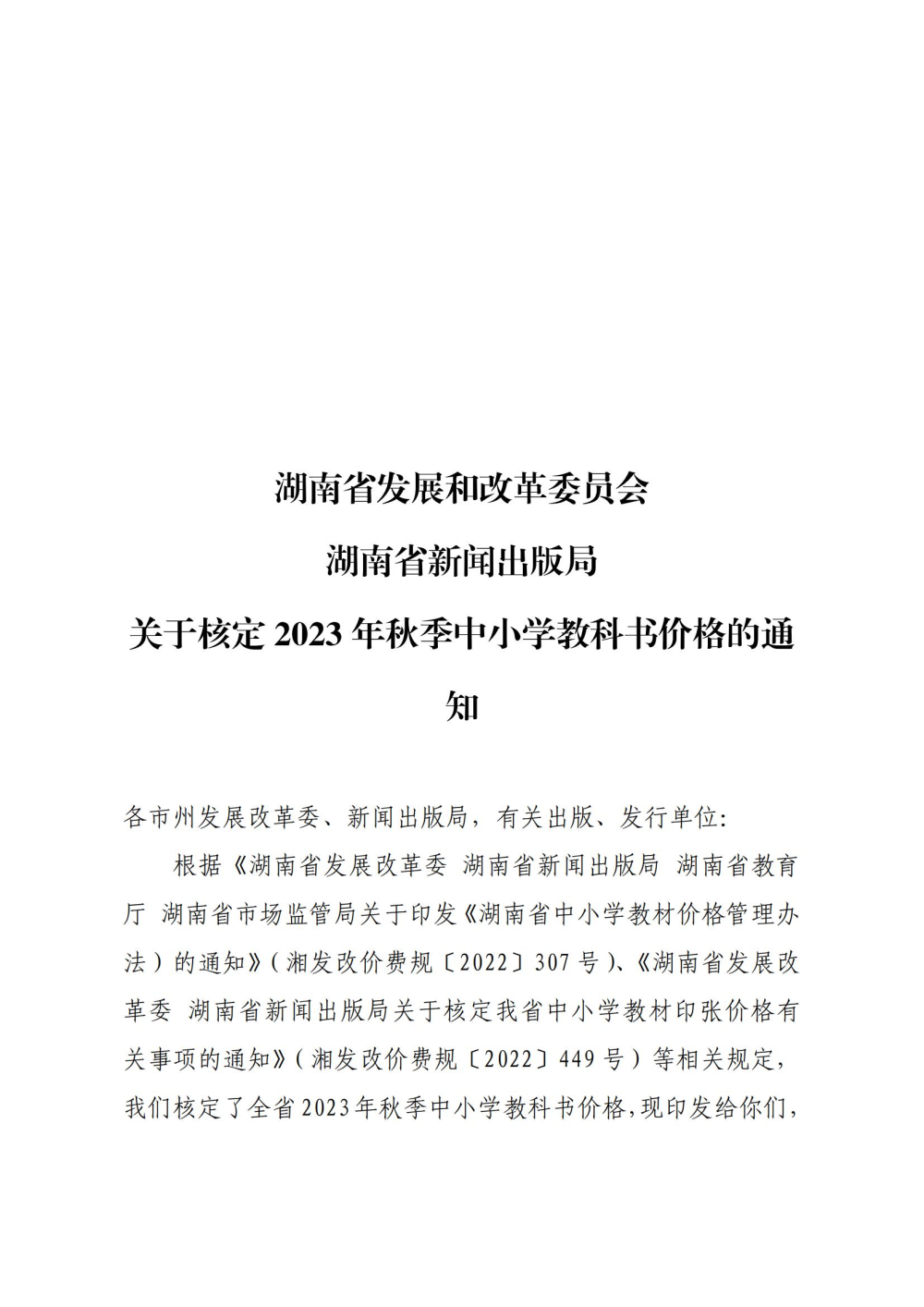 关于核定2023年秋季中小学教科书价格的通知