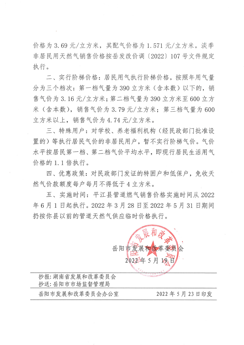 关于核定平江县管道燃气销售价格的通知(岳发改价商〔2022〕173号)