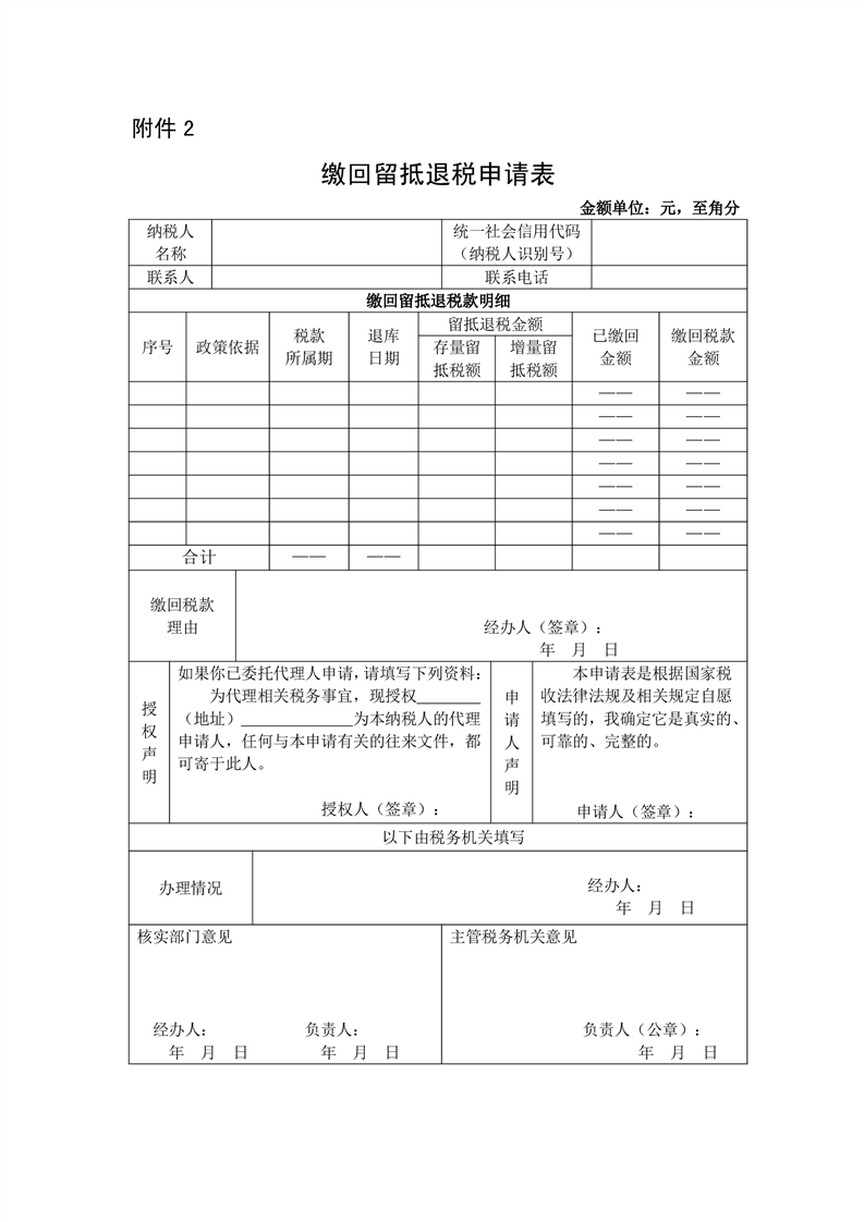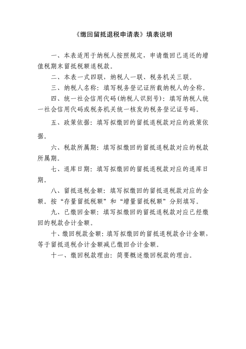 三、纳税人按照14号公告第十条的规定,需要申请缴回已退还的全部留抵退税款的,可通过电子税务局或办税服务厅提交《缴回留抵退税申请表》(见附件2)。税务机关应自受理之日起5个工作日内,依申请向纳税人出具留抵退税款缴回的《税务事项通知书》。纳税人在缴回已退还的全部留抵退税款后,办理增值税纳税申报时,将缴回的全部退税款在《增值税及附加税费申报表附列资料(二)》(本期进项税额明细)第22栏“上期留抵税额退税”填写负数,并可继续按规定抵扣进项税额。