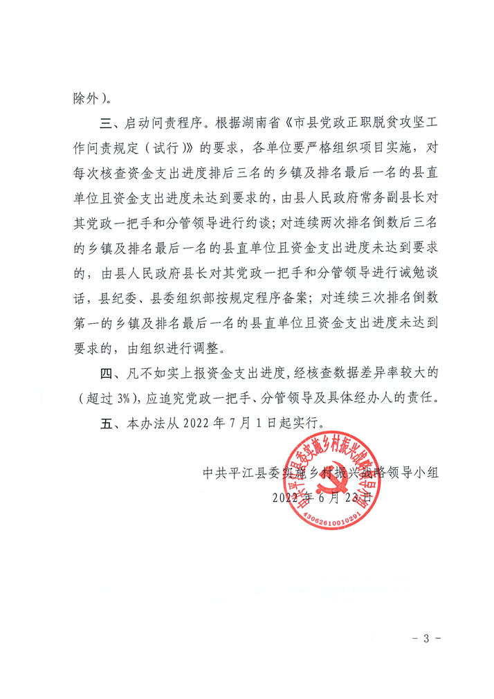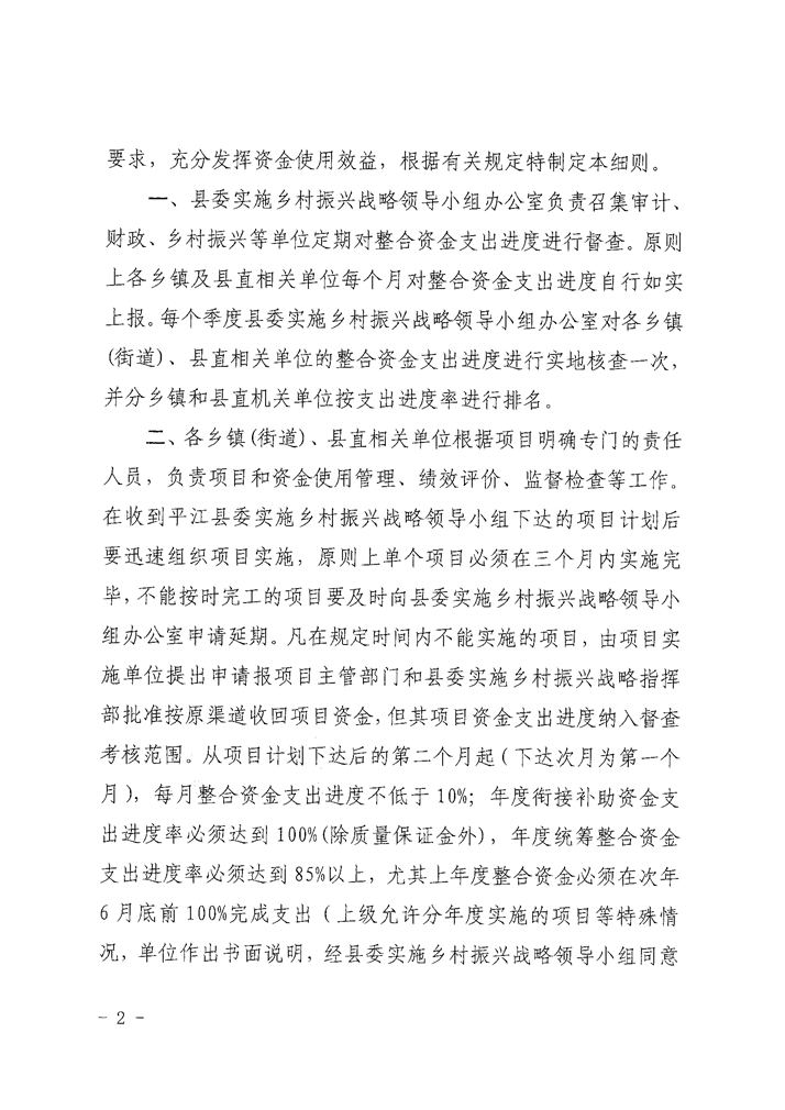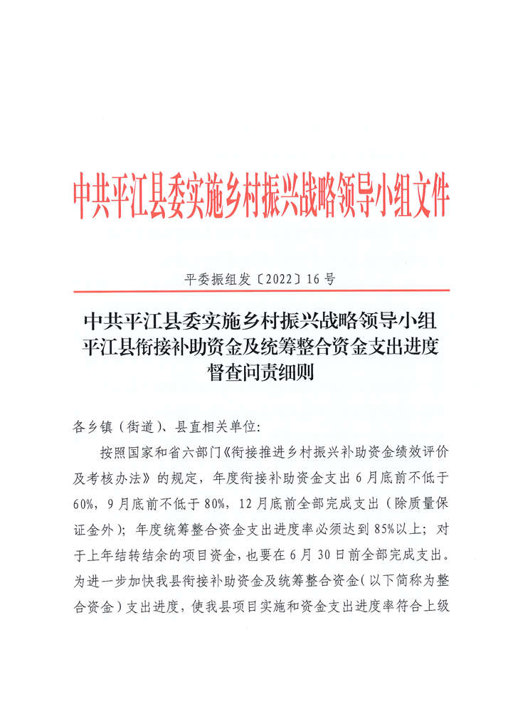 平江县衔接补助资金及统筹整合资金支出进度督查问责细则