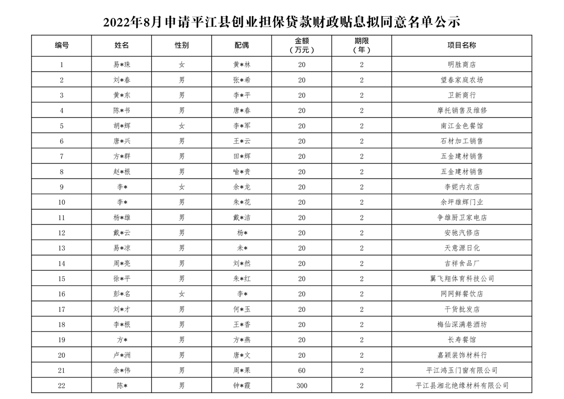 2022年8月申请平江县创业担保贷款财政贴息拟同意名单公示