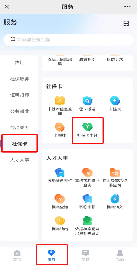 第二步:进入智慧人社APP,在下方引导窗口找到“服务”入口,点击“社保卡”事项,选择“社保卡申领”。