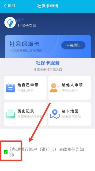 第三步:选择“给自己申领”或“给他人申领”,勾选《办理银行账户(银行卡)法律责任告知书》,按照办理步骤指引进行操作即可。