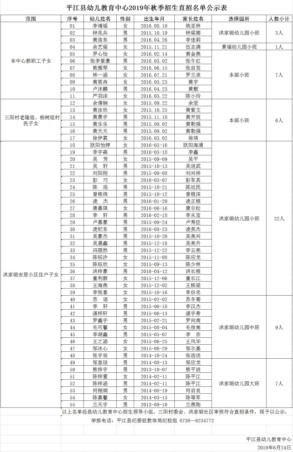 平江县幼儿教育中心2019年秋季招生直招名单公示