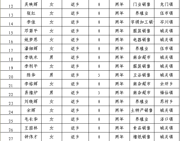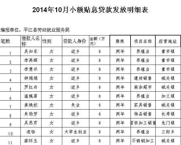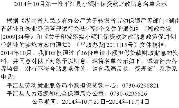 2014年10月第一批平江县小额担保贷款财政贴息名单公示