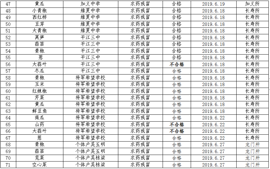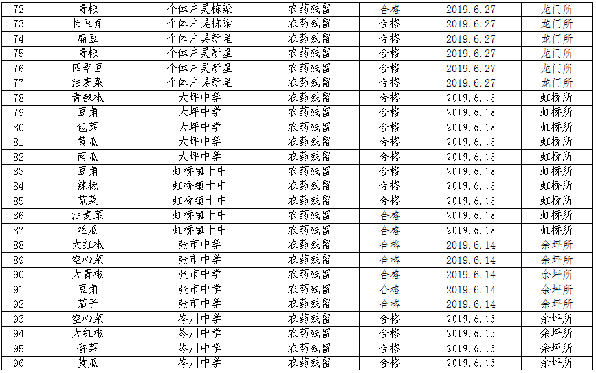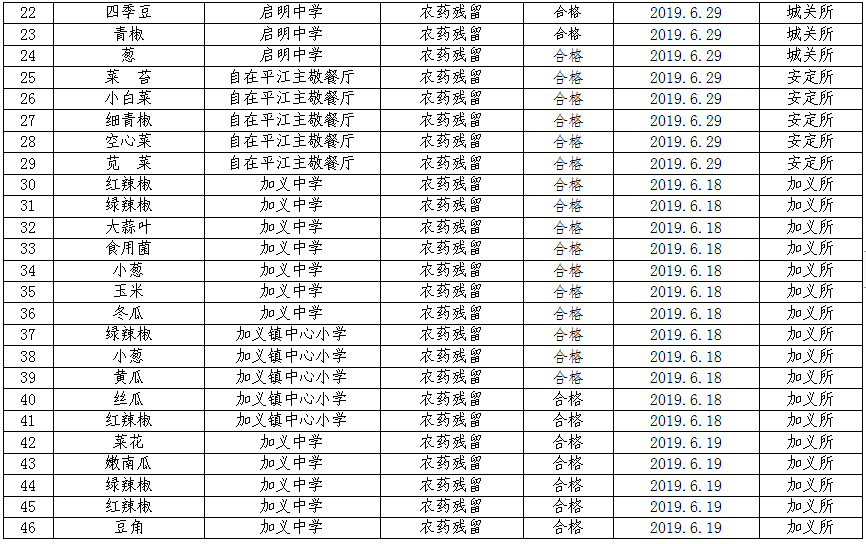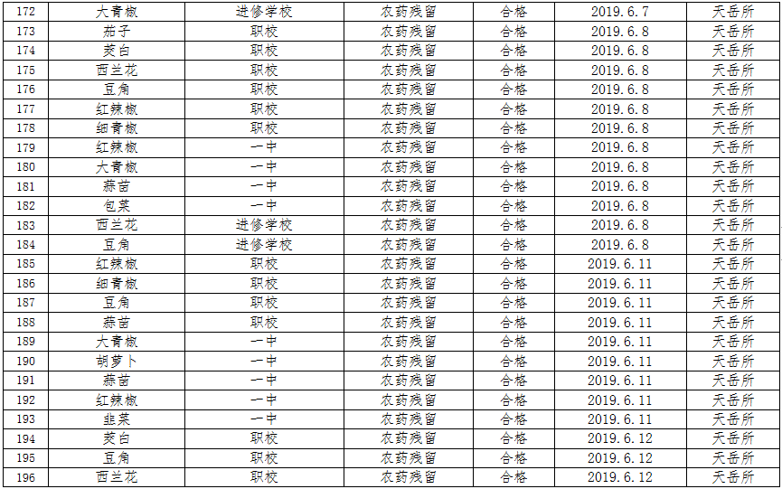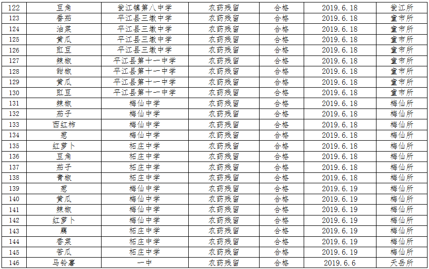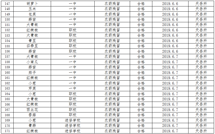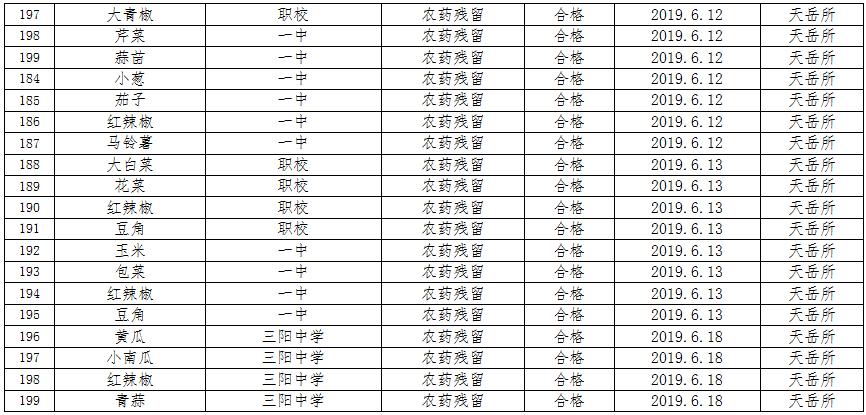 6月份共计检测食品中农药残留、食用油酸价、过氧化值199个批次,所检批次全部196个批次合格,3个批次不合格,合格率为98.5%,对检测不合格的产品已进行下架并作销毁处理。