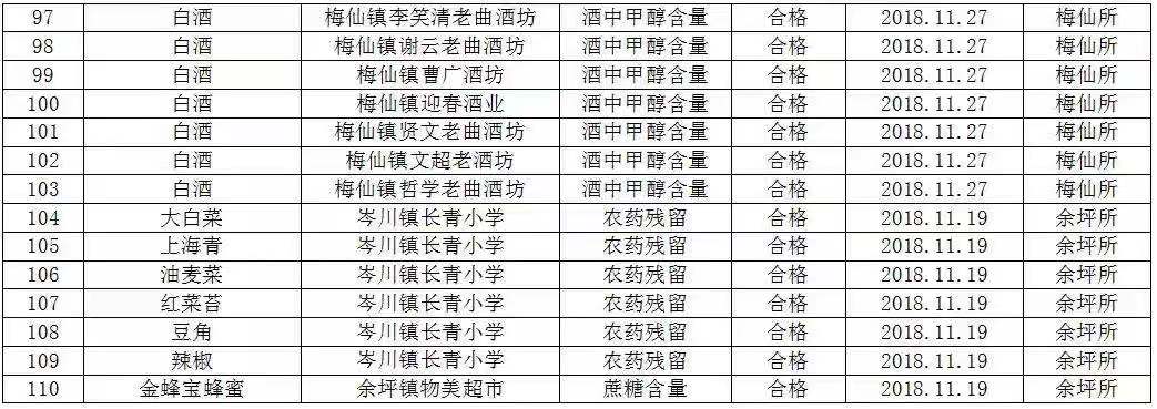 11月份共计检测食品中重金属铬含量、铝含量、肉类水分、瘦肉精、亚硝酸盐、硼砂、农药残留、蜂蜜中蔗糖含量、酒中甲醇含量110个批次,所检批次全部合格。