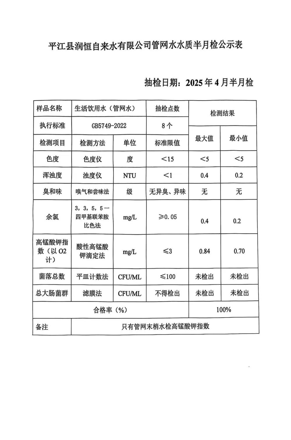 平江县润恒自来水有限公司管网水水质半月检公示表4.25