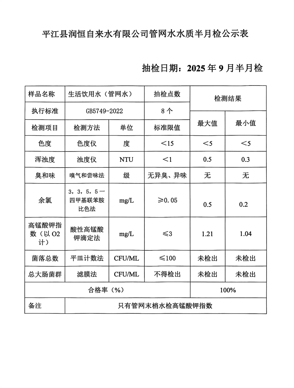 平江县润恒自来水有限公司管网水水质半月检公示表9.5