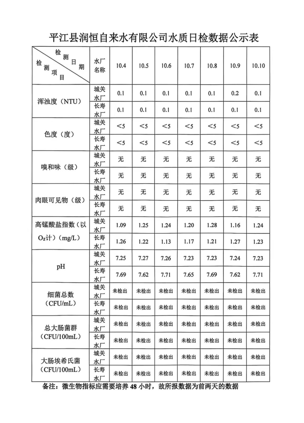 平江县润恒自来水有限公司水质日检数据公示表10.10