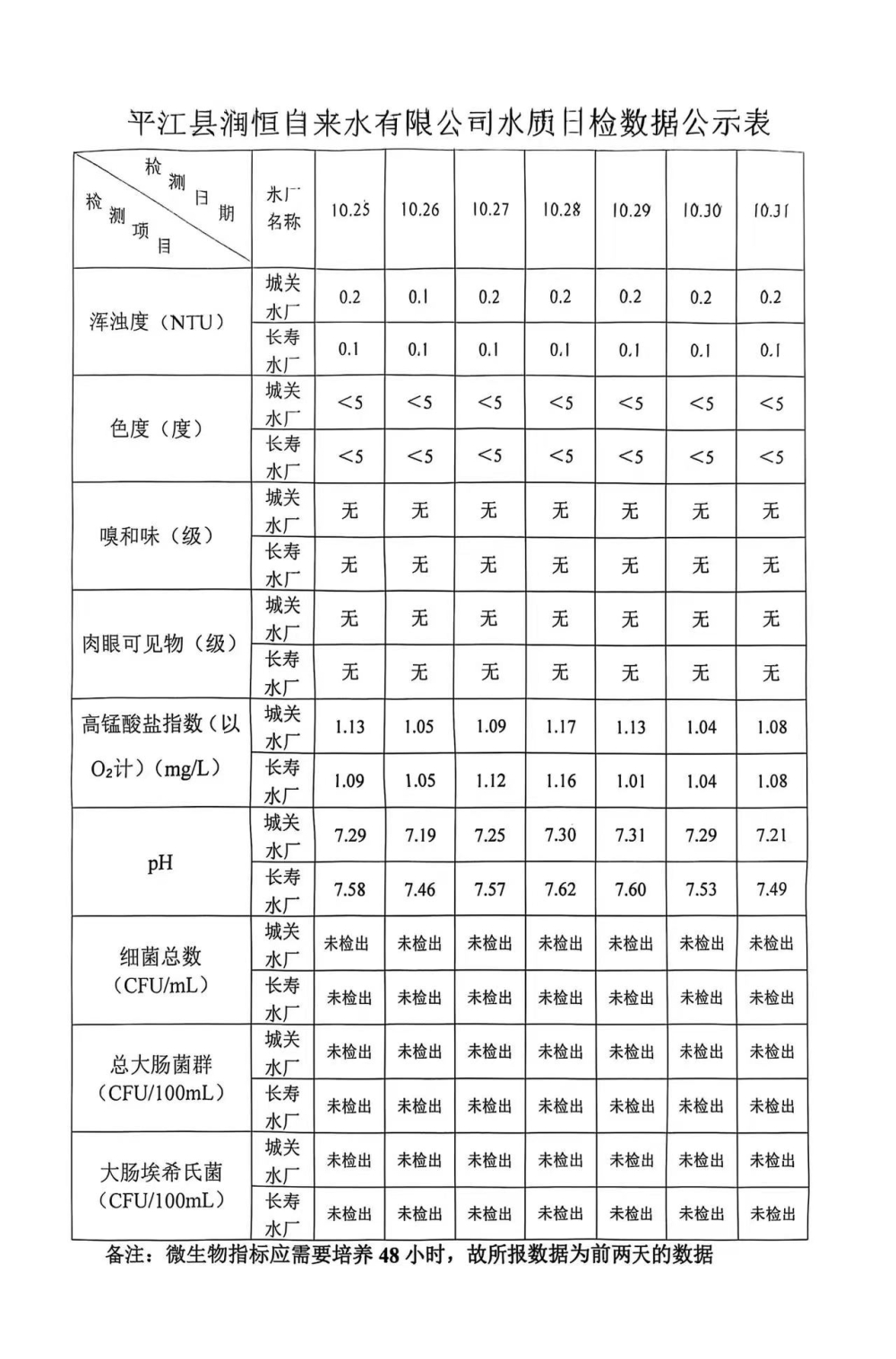 平江县润恒自来水有限公司水质日检数据公示表10.31