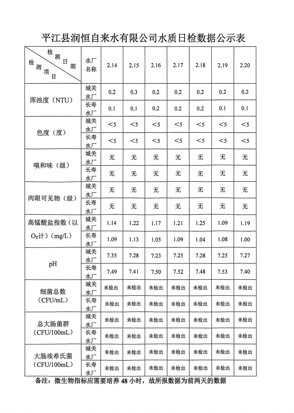 平江县润恒自来水有限公司水质日检数据公示表2.20