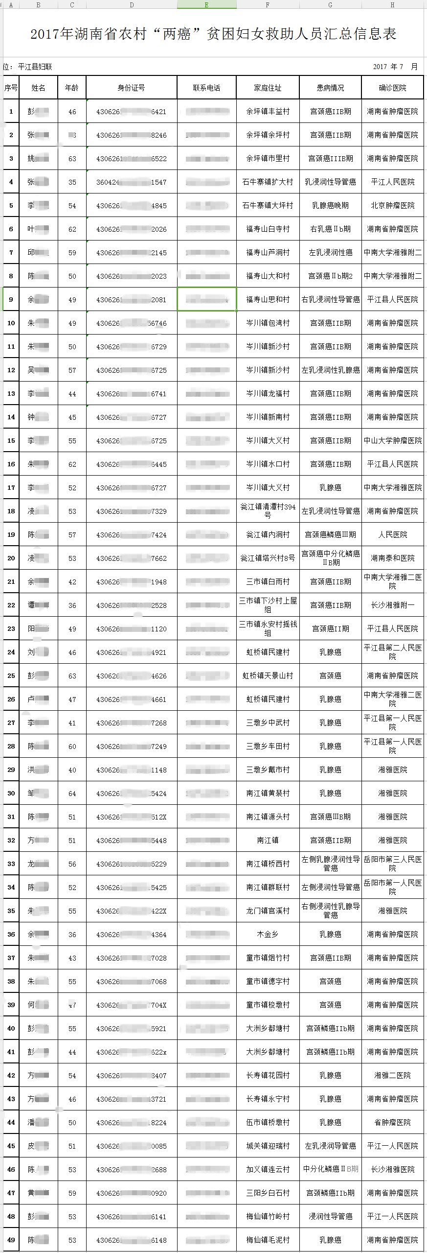 2017年湖南省农村“两癌”贫困妇女救助人员汇总信息表