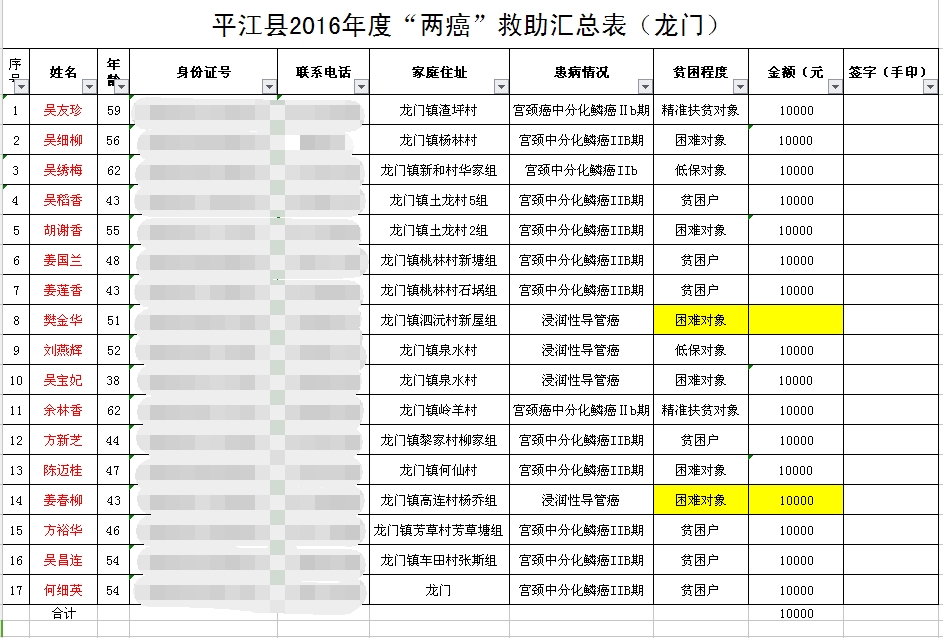 平江县2016年度“两癌”救助汇总表(龙门)