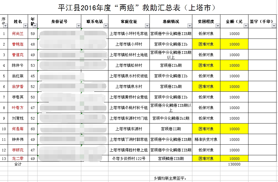 平江县2016年度“两癌”救助汇总表(上塔市)