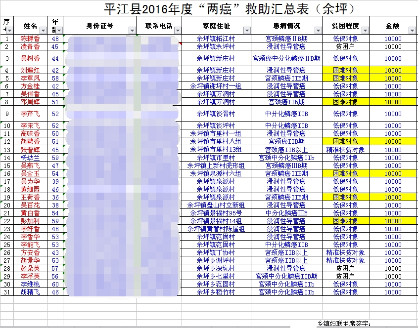 平江县2016年度“两癌”救助汇总表(余坪)