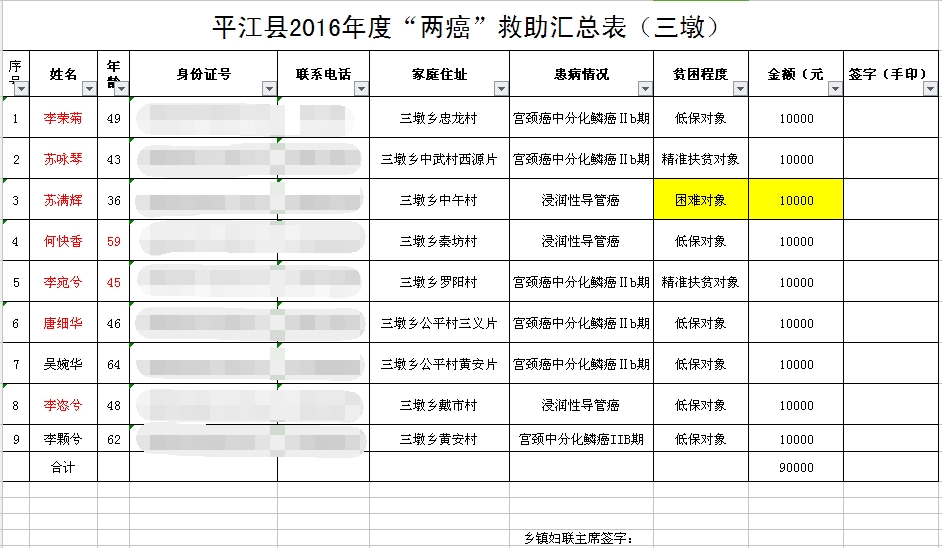 平江县2016年度“两癌”救助汇总表(三墩)