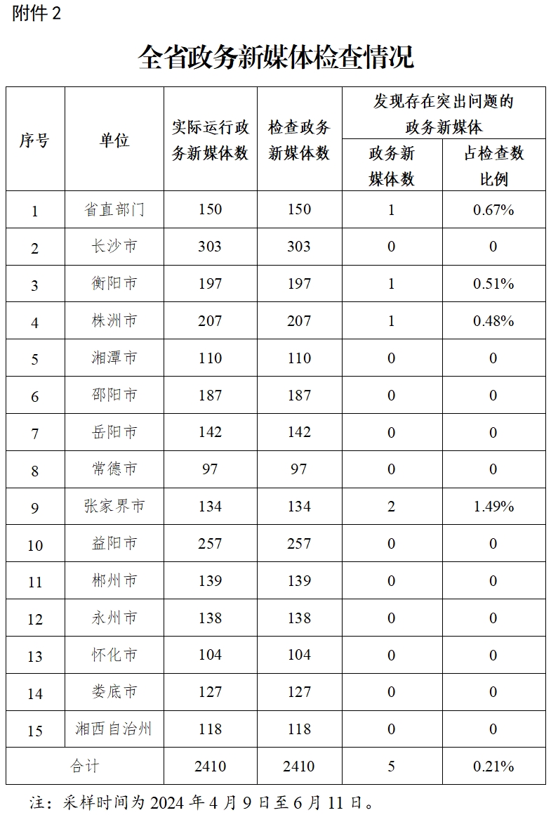 对全省正常运行的2410家政务新媒体进行普查,发现5家存在突出问题,总体合格率为99.79%。长沙市、湘潭市、邵阳市、岳阳市、常德市、益阳市、郴州市、永州市、怀化市、娄底市、湘西自治州政务新媒体检查合格率100%。二季度,各地各部门持续整治数字形式主义,有序关停政务新媒体账号161个,其中益阳市、长沙市、衡阳市关停数量较多。