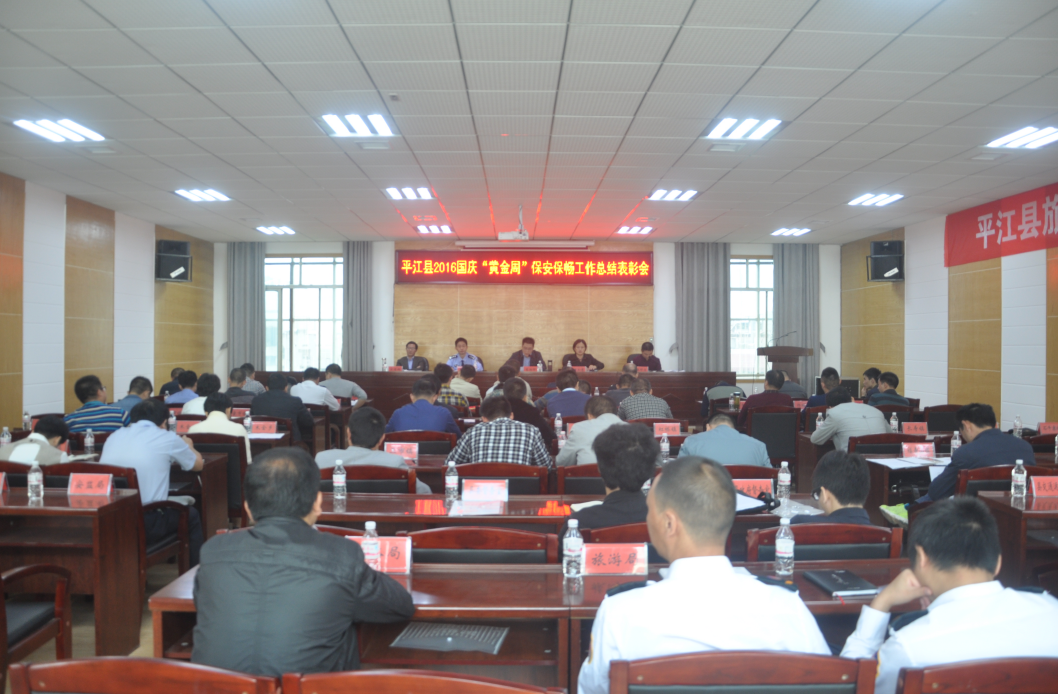 会上,副县长、县公安局局长姜伟南宣读了《关于2016年“十一”旅游黄金周保安保畅工作督查情况通报》;副县长潘如意宣读了《关于2016国庆“黄金周”保安保畅工作的情况通报》。会上对2016国庆“黄金周”保安保畅工作中的10个先进单位、10个特殊贡献个人和75个先进个人进行了当场颁奖。最后县委副书记肖湘晖作了重要讲话,他强调,这次国庆“黄金周”的旅游接待,是我县有史以来交通压力最大、接待任务最重、上级关注最多的一次,也是效果最佳的一次。既向外充分展示了平江得天独厚的旅游资源,展示了平江人民热情好客的良好形象,也极大地提升了平江旅游的知名度和品牌力,更是对我县各乡镇、各县直单位贯彻执行县委、县政府保安保畅安排部署会议精神的一次大检阅,创造了全县2016年“十一”旅游“零投诉、零事故”的保安保畅工作崭新局面,赢得了上级领导、来平游客、广大群众的普遍赞誉,实现了预期目的和效果。会议要求,大家一定要抢抓机遇,乘势而上,同心协力,开拓进取,扎实工作,为创建“国家全域旅游示范县”,为实现“绿富双赢”新平江而努力奋斗。