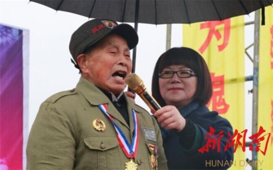 潇潇风雨中,民革湖南省委副主委傅莉娟为今年参加过天安门广场大阅兵的94岁老兵文正国撑伞、执麦克风;老人激情唱起了一首抗日战歌:“男儿报国在军营,不灭倭寇誓不还。”苍劲的歌声在山间回响,抚慰着露江山上长眠的英灵。(记者 徐亚平 通讯员 彭新华 张脱冬)