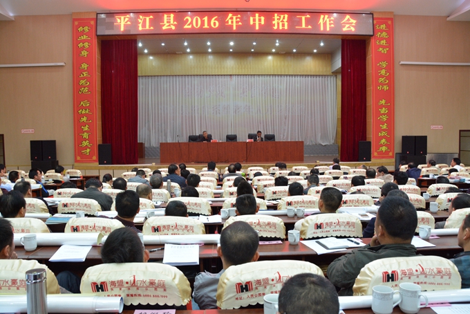 5月10上午,平江县2016年中招工作会召开,平江县教育体育局全体局务会成员,基础教育办、职成股全体成员,学区正副主任,普高学校校长、业务副校长,县职校正副校长、教导主任、招生办主任,初中学校校长、教导主任、九年级年级组长等共240余人与会,会议由平江县人民政府主任督学徐献安同志主持。