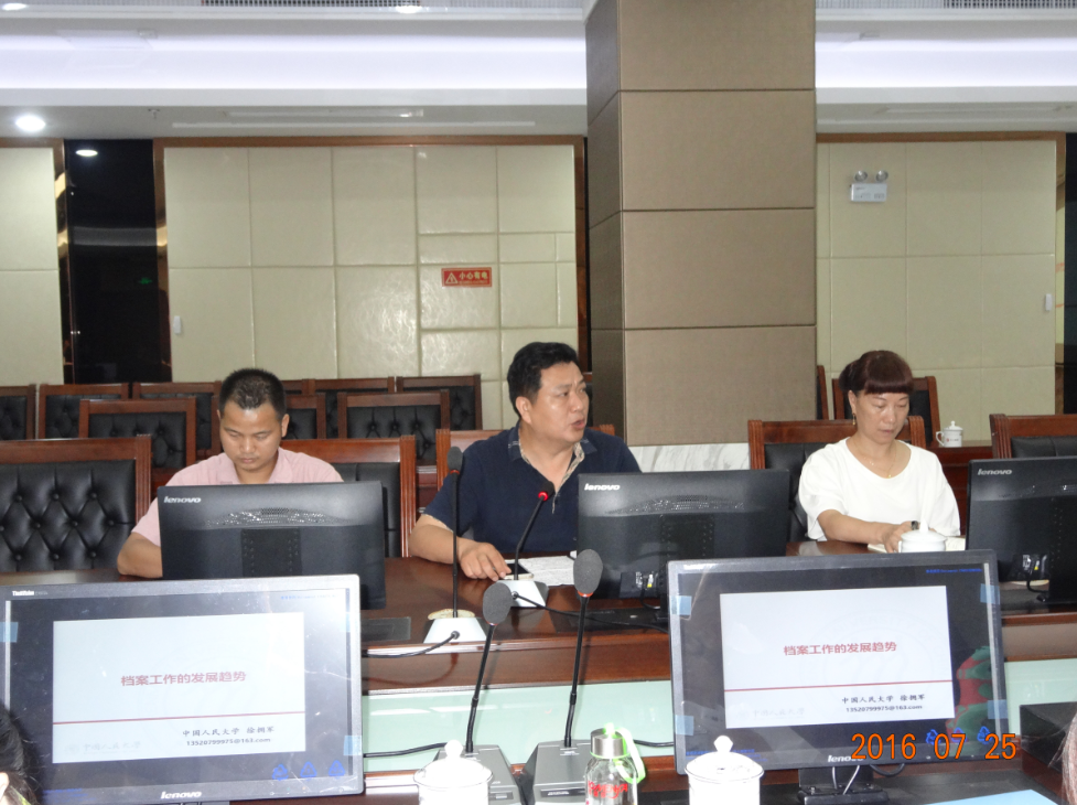 7月25日上午,县档案局有幸邀请到中国人民大学信息资源管理学院党委副书记、副教授、博士生导师(平江籍人士)徐拥军前来授课,徐教授从档案工作法制化、标准化、电子化、资产化、知识化等十个方面全面讲授了档案工作发展的新趋势,由浅入深,有理有例,给平江的档案工作人员开阔了视野,拓宽了思路。
