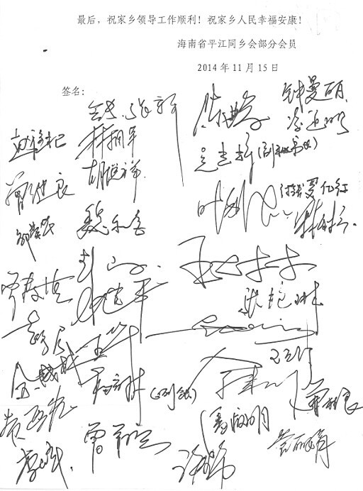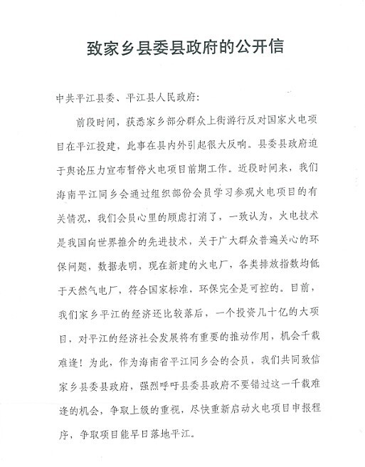 海南省平江同乡会部分会员致家乡县委、县政府的公开信
