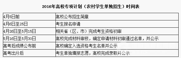 高校专项计划单报志愿、单独录取,在本科一批开始前完成录取,录取分数原则上不低于有关高校所在批次科类录取控制分数线。有关高校特别是农村学生人数相对较少的高校,要进一步增加招生名额,努力使本校农村学生人数明显增加。要充分考虑农村学生特点及相关地区基础教育实际,简化招录程序,探索适合农村学生的招生办法。采取安排分省计划录取的高校,要根据资格考生情况在有关省份编制招生来源计划,并进行标注说明。4月5日前,有关高校公布招生简章。4月25日前,考生在教育部阳光高考平台完成报名申请。5月15日前,有关省(区、市)完成考生资格初审。5月30日前有关高校完成考生申请材料审核。(县教育体育局办公室)
