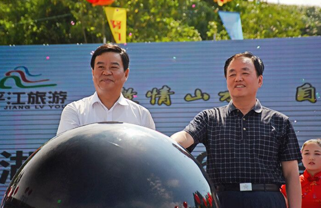 黄跃进、何报翔共同触摸启动球,2016湖南夏季乡村旅游节正式开幕。