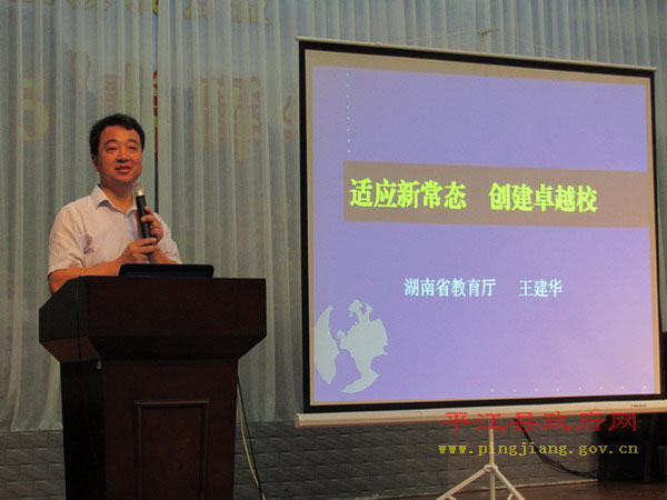 8月5日,炎天暑热,省教育厅党组成员、省委教育工委委员王建华来到平江暑期校长培训班现场,为中小学校长作《适应新常态,创建卓越校》专题讲座。县领导潘如意陪同。