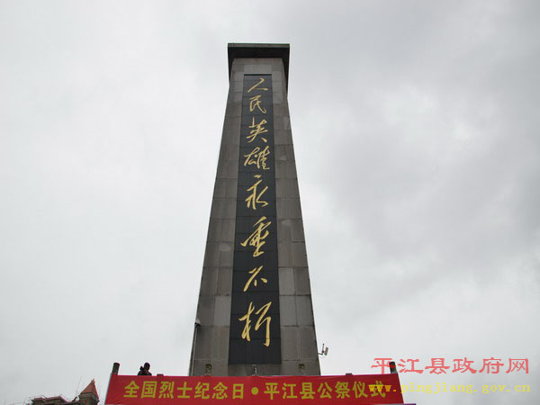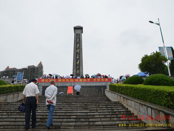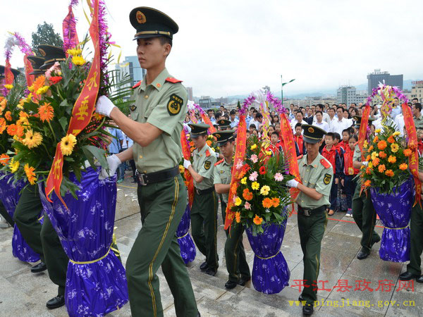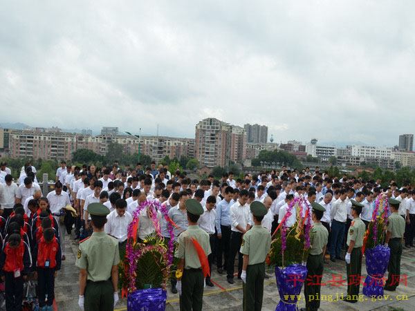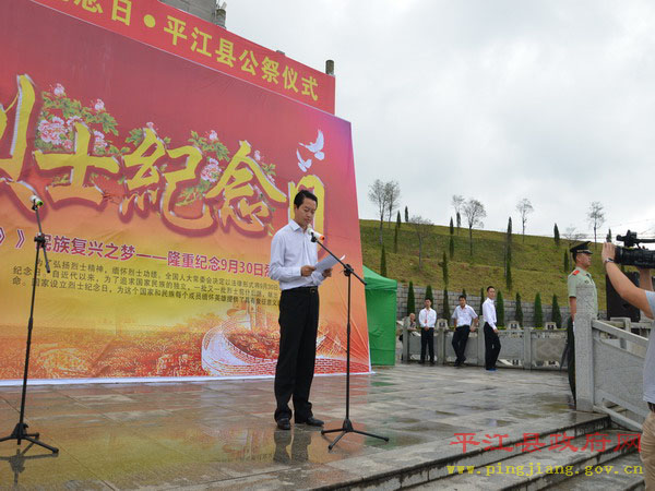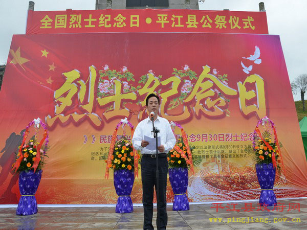 县委书记汪涛发表重要讲话,他指出,平江是一块浸透着无数烈士鲜血的热土。革命战争年代,曾发生过“二月扑城”、“平江起义”和“平江惨案”等重大革命历史事件,有25万优秀平江儿女英勇牺牲,其中登记在册的革命烈士达2.1万人,占全省烈士总数的五分之一。和平年代,为保护国家、集体和人民群众的生命财产安全,又有陈想林、唐泰昌等近20位英雄献出了宝贵的生命。他强调,发展是最好的继承,行动是最好的纪念。先烈们留下的革命精神,是我们攻坚克难的宝贵财富,是我们不懈奋斗的强大动力。他要求,全县上下要秉承先烈遗志,弘扬先烈精神,凝心聚力,开拓创新,奋勇向前,为十三五迈入全省20强,奋力谱写建设“一极三宜”江湖名城的平江篇章而努力奋斗!
