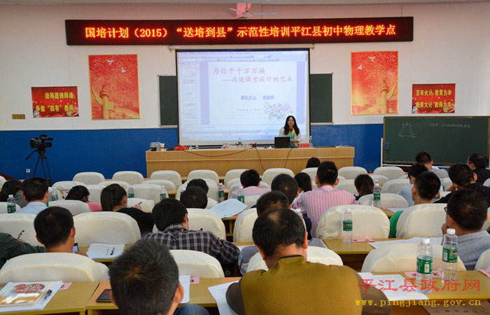 10月17日,湖南省“国培计划”(2015)“送培到县”示范性培训项目,在省中小学教师发展中心主任、党总支书记贾腊生带领下走进平江,我县600余名中小学教师,接受了高端、前沿的小学班主任、小学英语和初中物理教育教学培训。