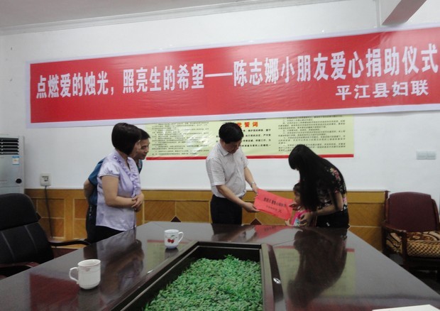5月26日,平江县妇联举行“点燃爱的烛光,照亮生的希望”陈志娜小朋友爱心捐助仪式,为纯红再生障碍性贫血患儿陈志娜小朋友送去10000元爱心救助金。县委副书记、县长谢春生参加仪式,亲自将救助金送到陈志娜小朋友手中,并祝她“六一”儿童节快乐。