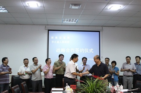 9月24日,湖南证监局局长熊国森带领该局处长以上负责干部,深入平江工业园视察指导,考察了南岭民爆、金程齿轮、方正达电子等企业。湖南证监局局长熊国森与中共平江县委书记王洪斌代表双方签订了战略合作协议。湖南证监局将对平江工业园进行长期的项目扶持和支持,为平江工业园推介产业、引进项目、培育上市企业,争取通过3年左右时间的共同努力,在平江工业园扶持1-2家上市公司,引进1-2家知名上市企业落户园区。