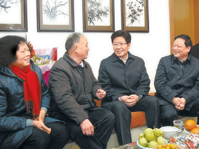 本报记者 陈亚静 2月12日,腊月二十九,省委书记、省人大常委会主任张春贤冒着严寒,走进大中小学校园和教师家中,看望为教育事业、科研工作做出突出贡献的退休老教师和院士代表,并向全省教育工作者致以亲切的问候和新春祝福。省领导杨泰波、陈润儿陪同看望。 “教育神圣、教师光荣” 年近古稀的舒明华是长沙麓山国际实验学校小学部的退休语文教师,她曾被评为全国优秀教师。12日一大早,张春贤就来到舒明华老师的家中。 “今天特地来给您拜年,也想听听您的心里话。”落座后,张春贤与舒老师聊了起来,“基础教育至关重要,您这么多年一直从事教育工作,在这方面有什么好的建议?” “在党和政府的高度重视下,教育事业有了很大的发展。抓素质教育,还得继续为孩子们‘减负’,现在的孩子课外作业、补习任务各种负担还是很重。” 张春贤接过话头说:“推进素质教育,就是要提高孩子们的创新精神和实践能力,要给孩子们更广阔的空间去发挥各自特长,不断适应现代社会的要求。” 如何提升教师自身素质,小学教材怎样进一步完善……围绕这些关注的话题,省委书记与退休教师犹如久别的老友,有说不完的心里话。 “‘如果有来生,我还愿做老师。’一位老教师曾经跟我说过的这句话,让我非常感动。教育神圣、教师光荣,感谢你们对岗位、对孩子的热爱,感谢你们为教育事业作出的贡献!”临别时,张春贤关切地对执意要送行的舒明华说:“外面天气寒冷,您留步。” “没关系,我的心是温暖的。”舒明华动情地说。 随后,张春贤又前往长沙市28中,看望退休英语教师周建国。周老师曾荣获全国优秀教师、长沙市突出贡献教师称号。 来到周老师的家,一眼就看到大门上红彤彤的春联。周建国乐呵呵地指着春联横批对张春贤说:“去年咱们湖南发展非常不错,老百姓生活幸福祥和,所以,我特意贴上了‘政通人和’。”笑声在屋子里久久回荡。 周建国告诉张春贤,自己从教36年,曾经有很多次机会可以转行,但都难以割舍对教育事业的感情。“我是真心喜欢教师这个职业,一干就是一辈子。” 张春贤听后动情地说:“湖南要实现富民强省、科学跨越,要增强长远竞争力,教育是重要基础。感谢老教师们把一生奉献给了教育事业,希望你们继续发挥余热。” 告别时,周建国对张春贤说,“快过年了,您还在奔波,还牵挂着我们,我们也希望您早点回家团年。” “湖南就是我的家。”张春贤说。 “创新是湖南的无限财富” 马上就是大年了,中国工程院院士、粉末冶金专家黄伯云仍然没有放下手中的工作。张春贤走进中南大学大飞机机轮刹车系统工作室,为黄伯云院士送上鲜花和新春祝福。 一见面,张春贤就握着黄伯云的手说:“黄院士跟我是老朋友了,每隔一段时间就想来看看您。” “中南大学2009年签订产学研合作合同300多项,发起和参与组建了7个大型海内外产业技术创新联盟和4个产学研合作基地。”在工作室里,黄伯云向张春贤介绍起他们自主创新的累累硕果。 张春贤说,中南大学以新材料创新为基础,不断提高自主创新能力,产学研步伐不断加快,为教育强省和建设创新型湖南作出了贡献。高等教育重点要提高质量、加强创新,加强重点学科和创新平台建设,加强自主创新和成果转化,使大学成为培养和集聚拔尖人才的重要基地。创新将是湖南的无限财富,中南大学要在加强自主创新上进一步作出贡献。 张春贤一直十分关注高校的发展,多次来到中南大学考察调研。在与中南大学负责人交谈中,他再次关切地询问起大学城建设、各类人才培养等方面情况,要求省市有关部门对中南大学的发展进一步给予支持。 离开中南大学时,学校负责人将一份成果简报送给张春贤,张春贤高兴地说:“这是送给我最好的贺年卡!” “农业优势只能加强不能削弱” 72岁的中国工程院院士官春云,从1959年起,致力于农业领域教学科研工作,在油菜高产优质高效栽培、育种理论和应用研究方面作出了突出贡献。 临近中午,张春贤来到位于湖南农业大学校园内的官春云家中。围绕农业科技创新、现代农业发展等共同关注的话题,两人促膝畅谈。 “到目前为止,我们一共育成优质油菜良种22个,不仅有效提高了亩产量,更大幅度降低了农户的生产成本。2009年又在湘潭、衡阳等地开发了20多万亩新品种的试验田。”官春云笑着向省委书记报喜。 “省内油菜机播面积已占到多大比例?农业规模经营还需要加强什么?农业方面的高科技人才怎样才能留得住、引得来?”张春贤接连发问。 “要进一步加大土地流转力度;机耕道等农田基本建设步伐还要加快,以适应现代农业发展需要;要进一步加大对机械大户的扶持力度,鼓励开展农业机械租赁业务,降低农业生产成本;要大力发展民族种业,加快品种改良;高科技人才,要注重自己培养和大力引进相结合。”官春云连连提出自己的建议。 “这些建议是最好的新年礼物。”张春贤说,湖南作为农业大省,农业优势只能加强、不能削弱。要把建设现代农业作为转变经济发展方式的重大任务,要在稳定发展粮食生产、坚守“四条底线”的前提下,以农民增收为基本目标,对传统主导产业进行改造提升,推进规模化经营和标准化生产,扩大优势,把产业做大;要大力培养和引进高科技人才,注重发挥科技创新的作用,加快品种改良,研发和推广运用先进实用