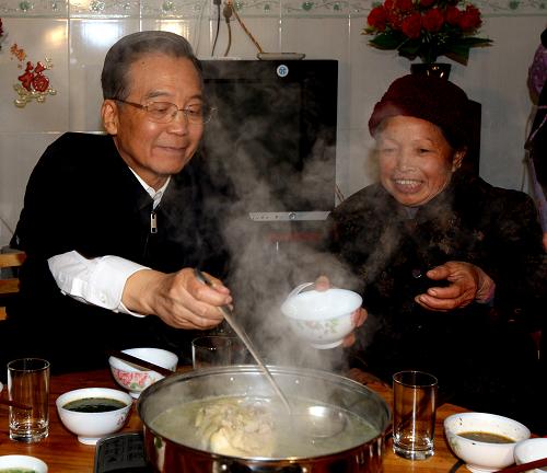 这是2月13日,温家宝在巴马瑶族自治县巴马镇练乡村村民蓝庆明家吃年夜饭。新华社记者 姚大伟 摄