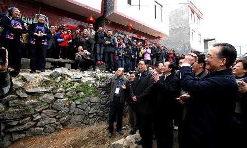 2月12日至14日,新春佳节到来之际,中共中央政治局常委、国务院总理温家宝来到广西壮族自治区河池、百色等地,看望慰问各族群众,共迎虎年春节。这是2月12日,温家宝来到位于大山深处的东兰县三石镇巴造村,向村民致以节日的问候。新华社记者 姚大伟 摄