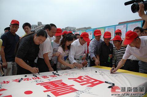 各级领导、企业负责人、现场群众在“质量·安全”条幅上签名承诺,倡导质量诚信风气。